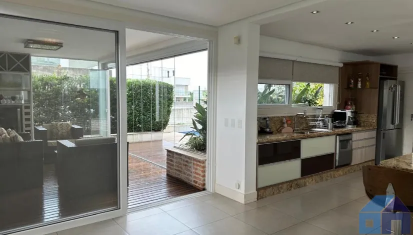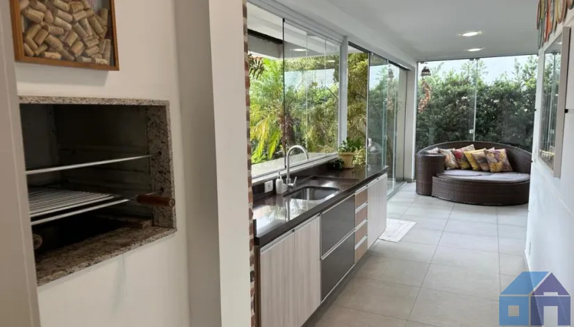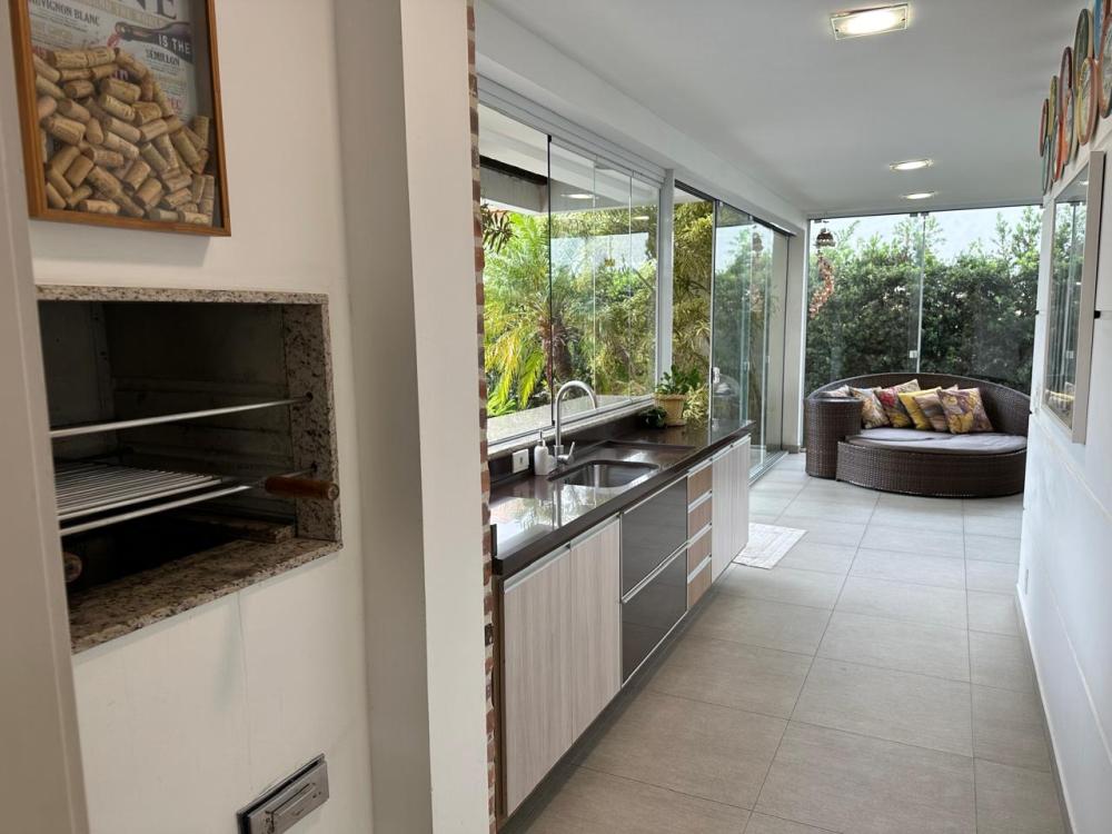 Cozinha com móveis planejados espaço gourmet interno com churrasqueira.