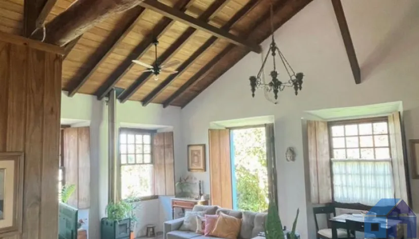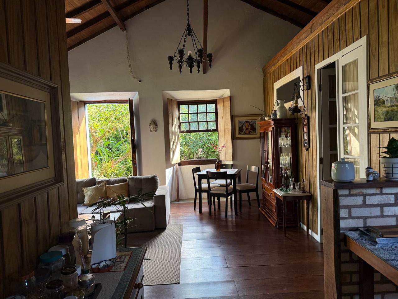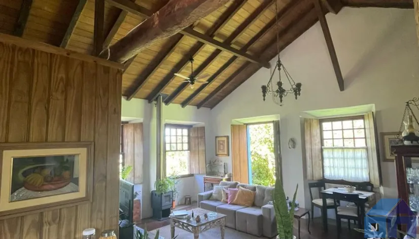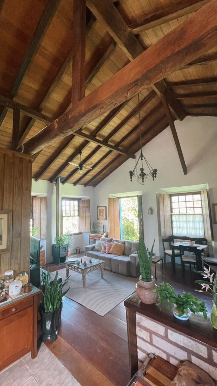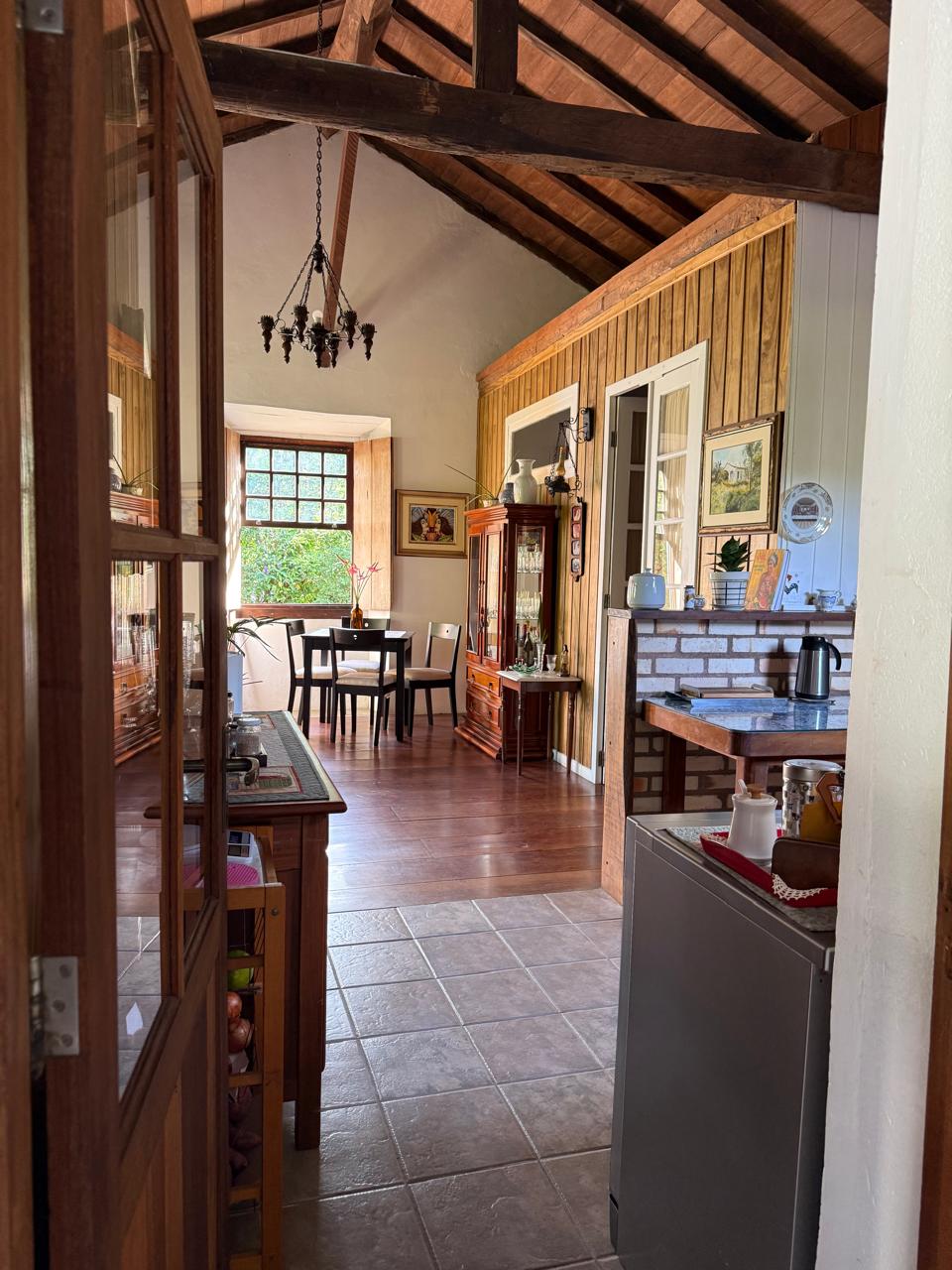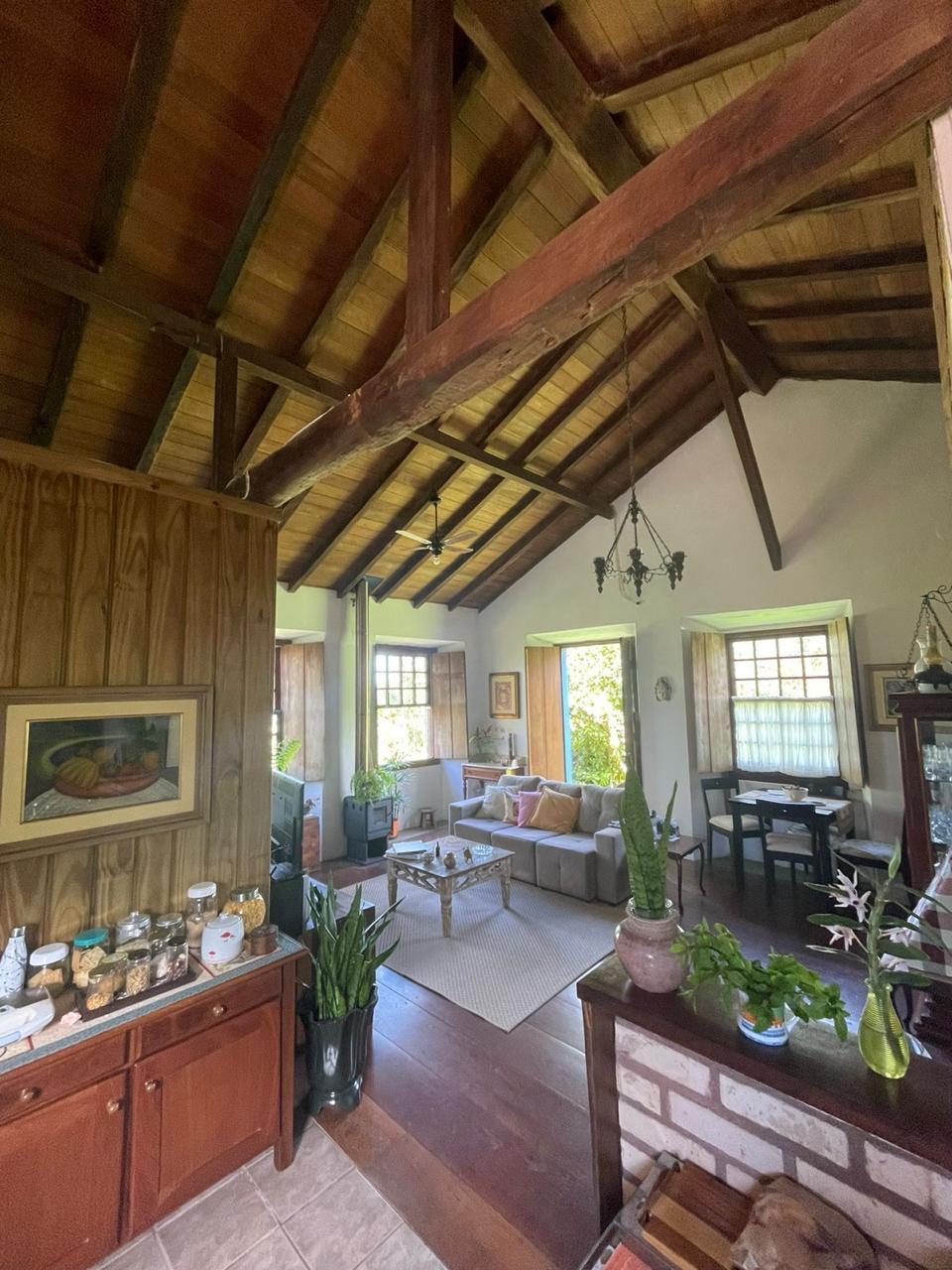 O imóvel combina perfeitamente o estilo rústico com ambientes acolhedores, trazendo elementos originais como teto com vigas aparentes em madeira, amplas aberturas que proporcionam excelente iluminação natural e integração com o verde ao redor.