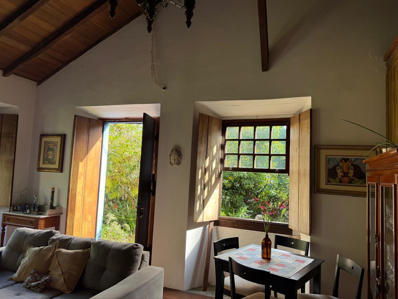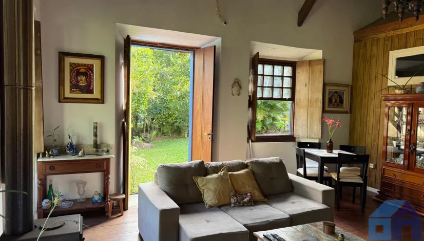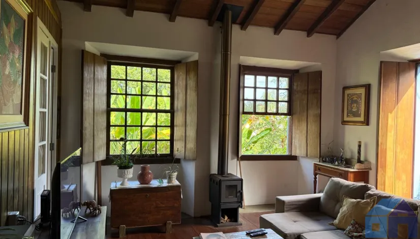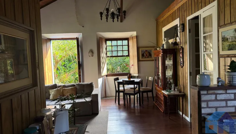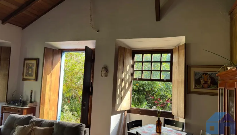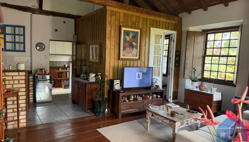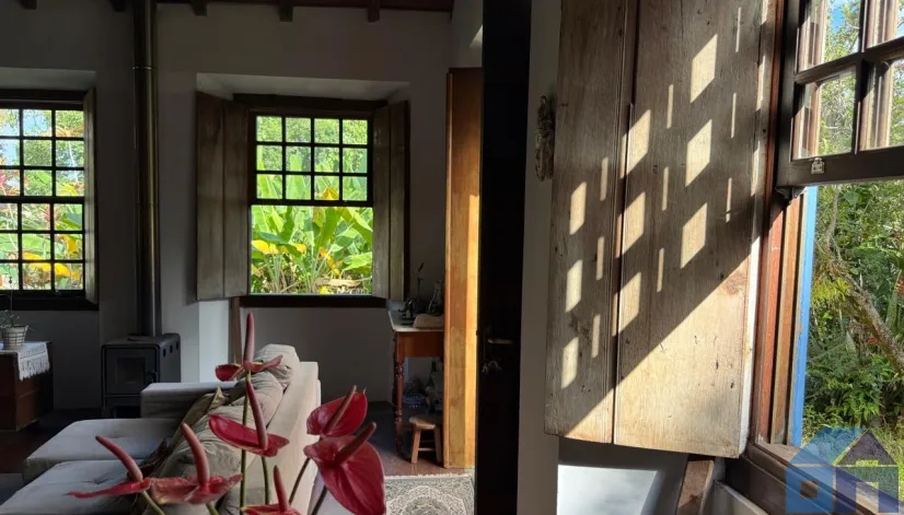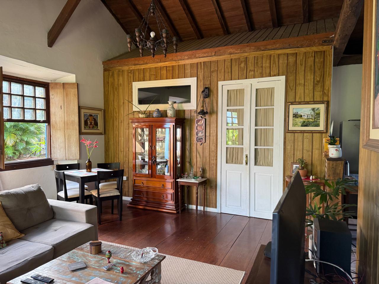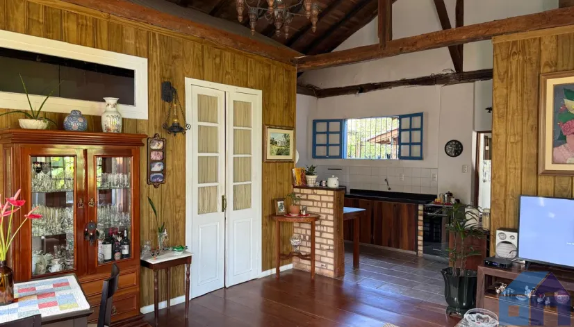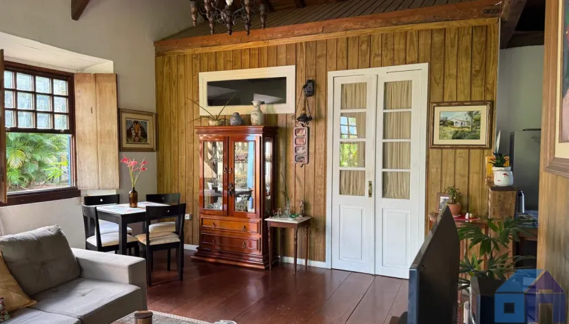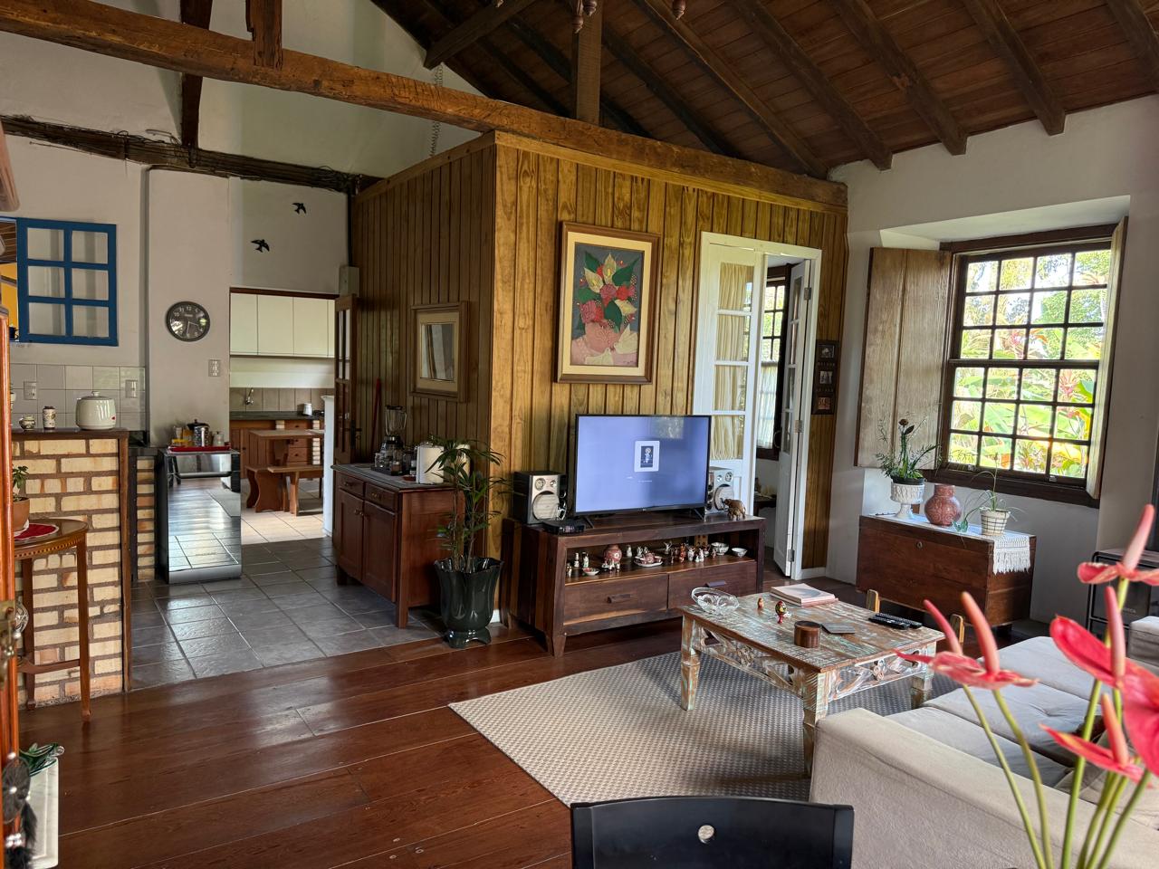 O imóvel combina perfeitamente o estilo rústico com ambientes acolhedores, trazendo elementos originais como teto com vigas aparentes em madeira, amplas aberturas que proporcionam excelente iluminação natural e integração com o verde ao redor.