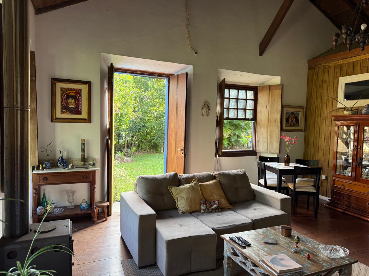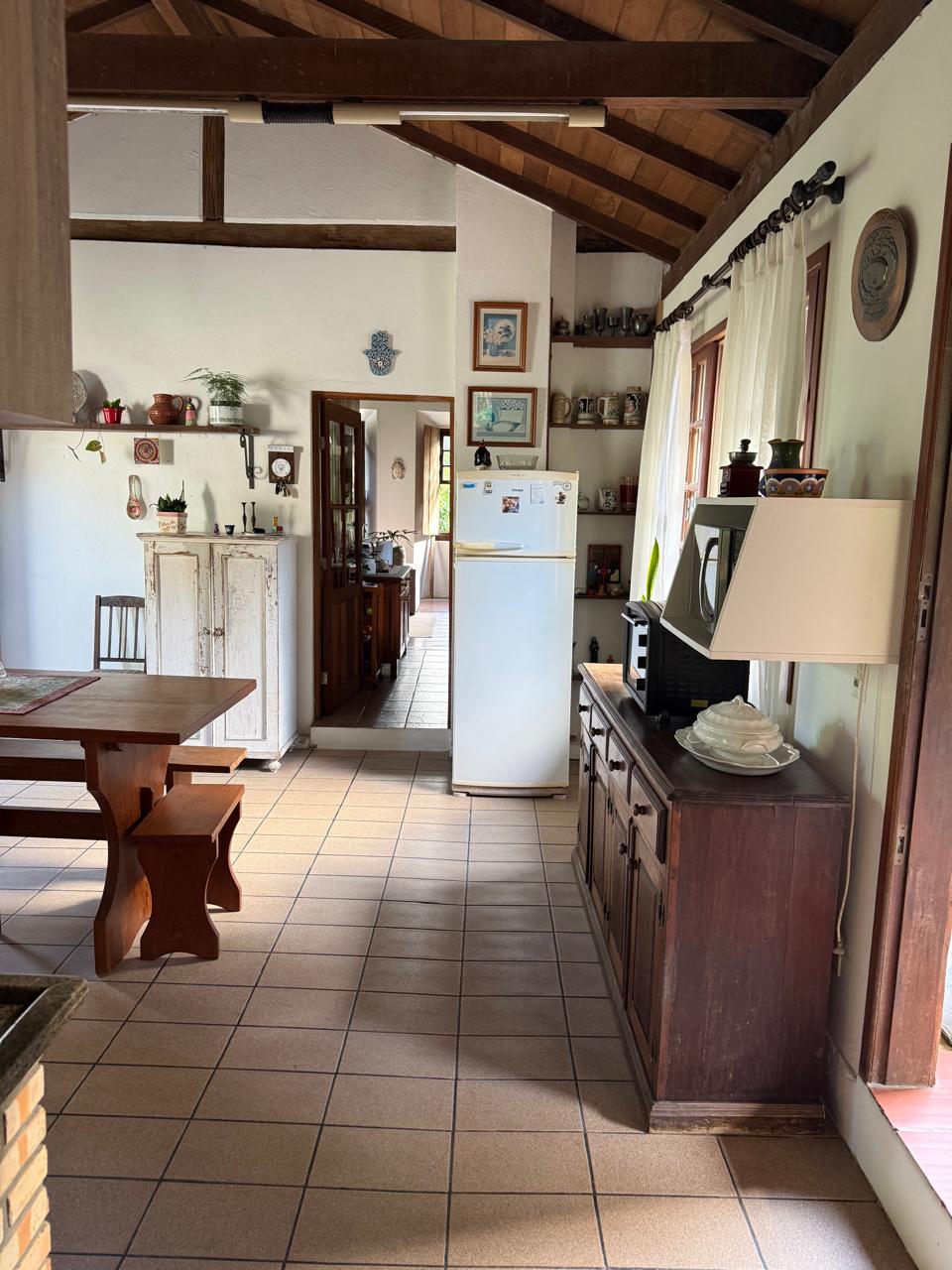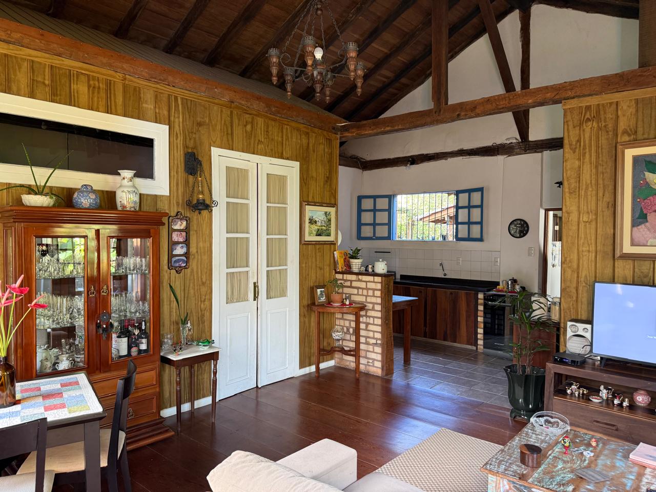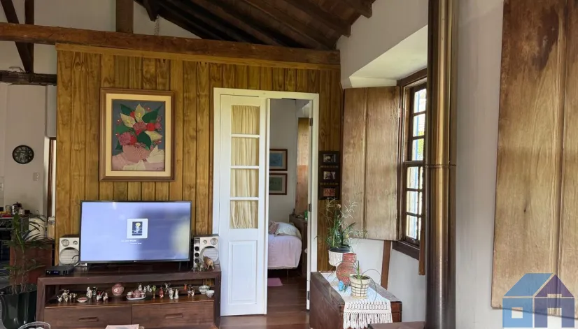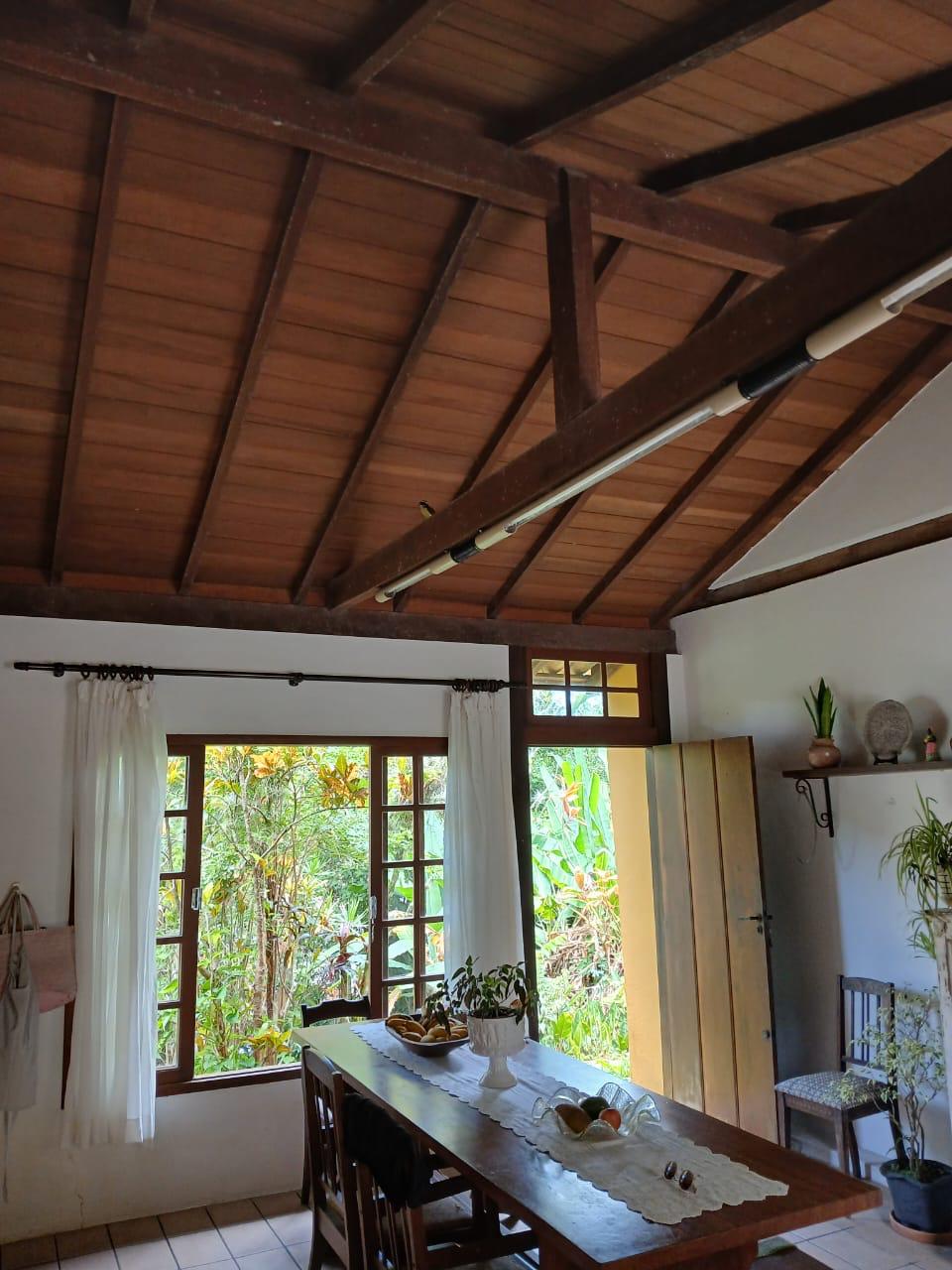 O imóvel combina perfeitamente o estilo rústico com ambientes acolhedores, trazendo elementos originais como teto com vigas aparentes em madeira, amplas aberturas que proporcionam excelente iluminação natural e integração com o verde ao redor.