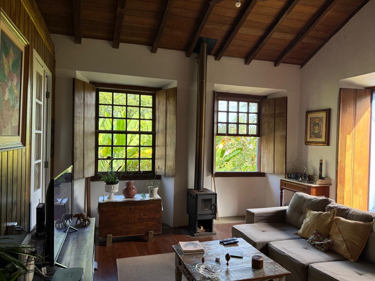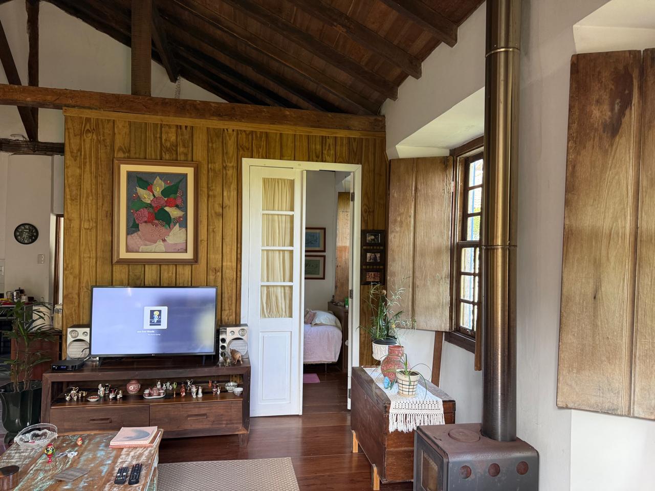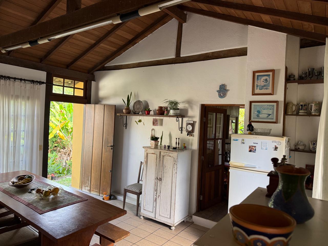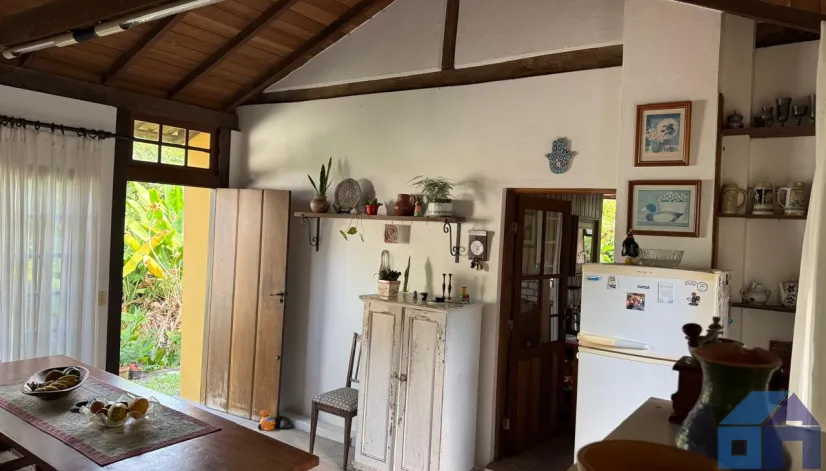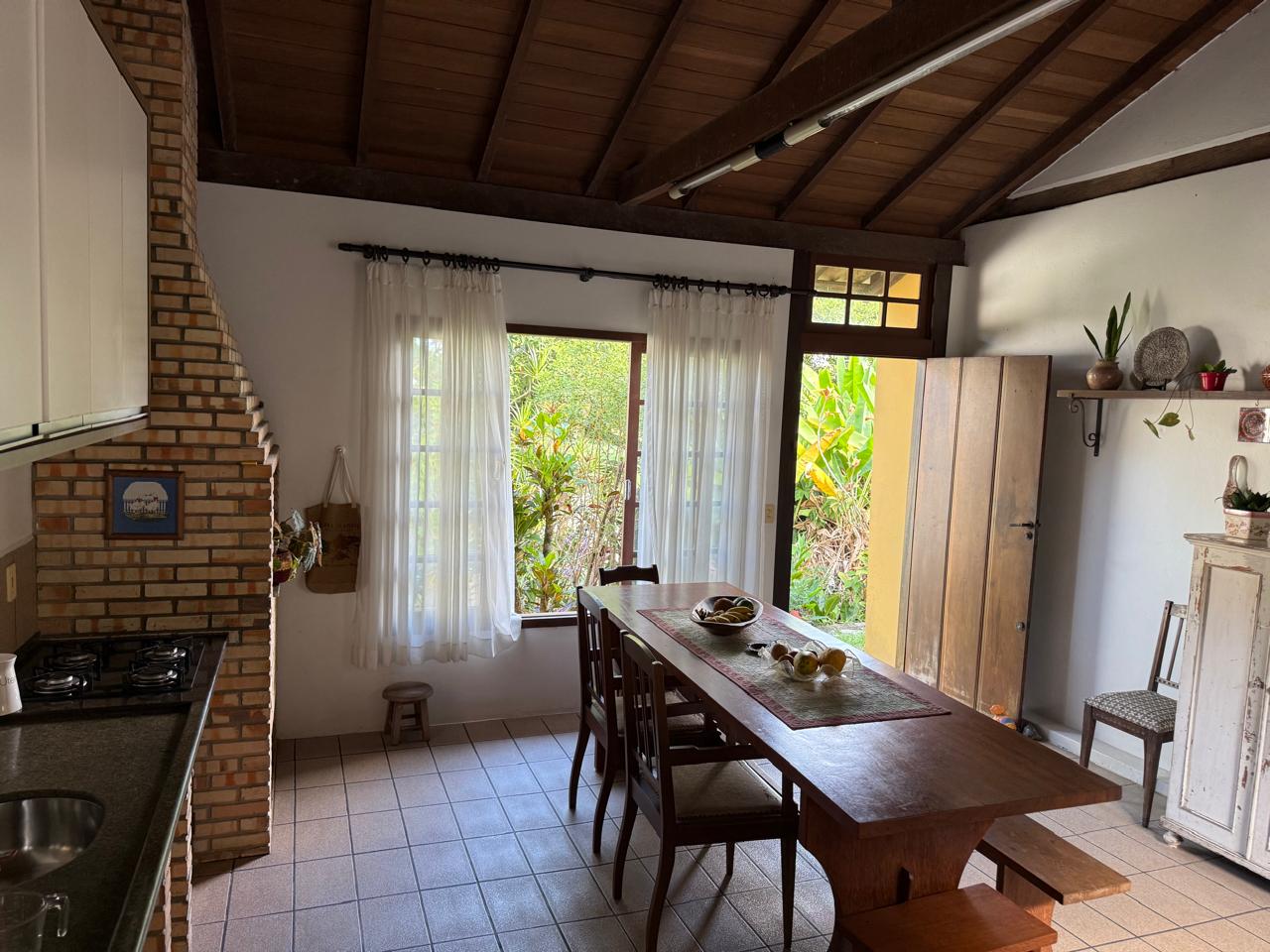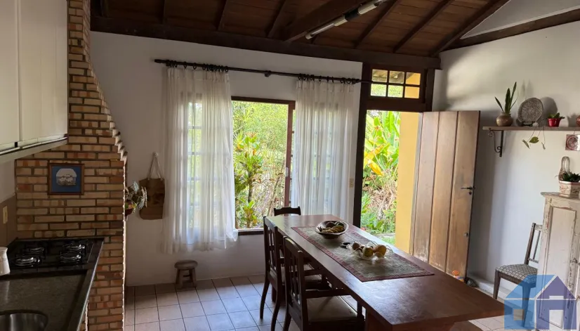 O imóvel combina perfeitamente o estilo rústico com ambientes acolhedores, trazendo elementos originais como teto com vigas aparentes em madeira, amplas aberturas que proporcionam excelente iluminação natural e integração com o verde ao redor.