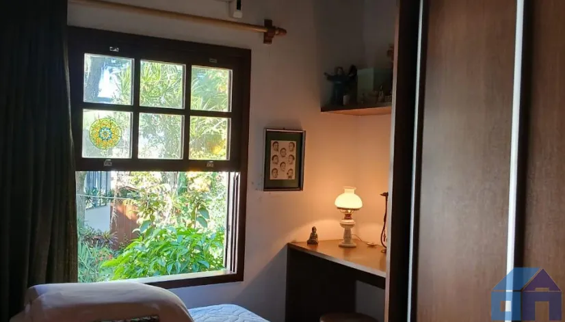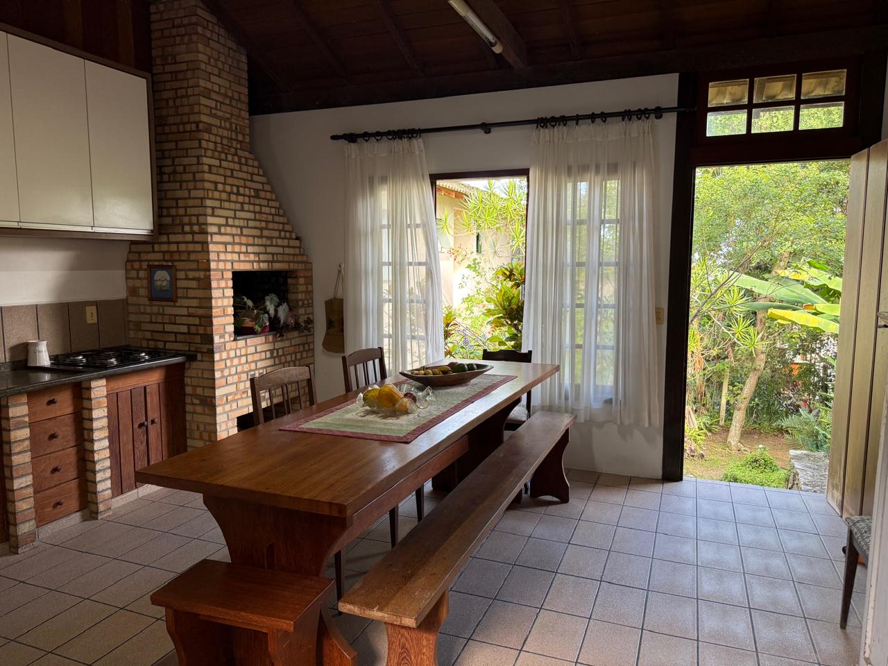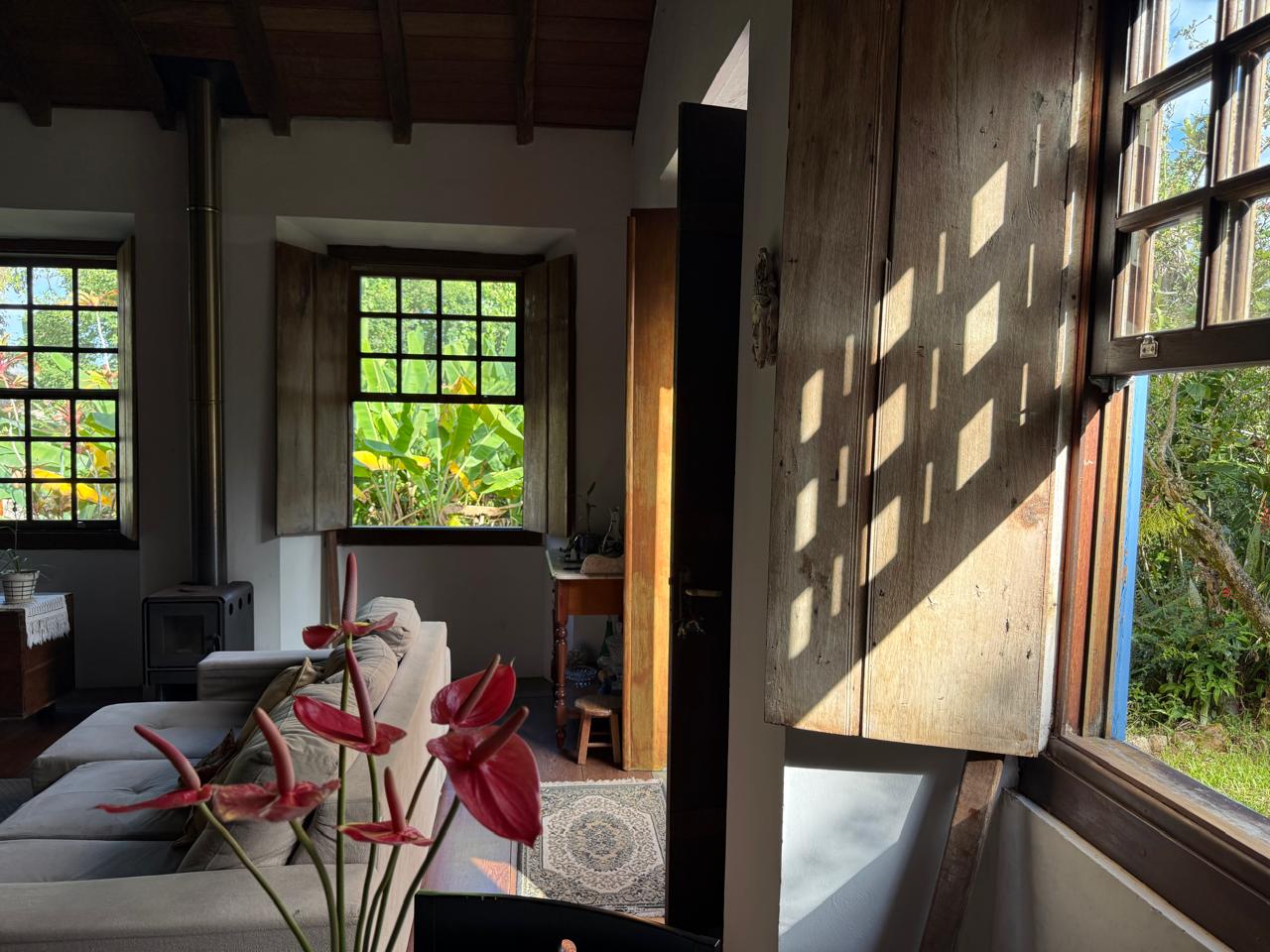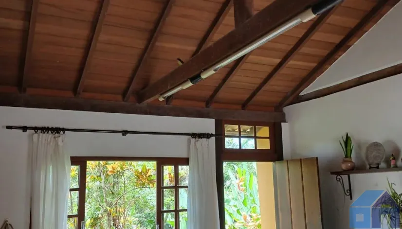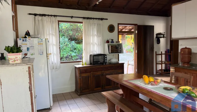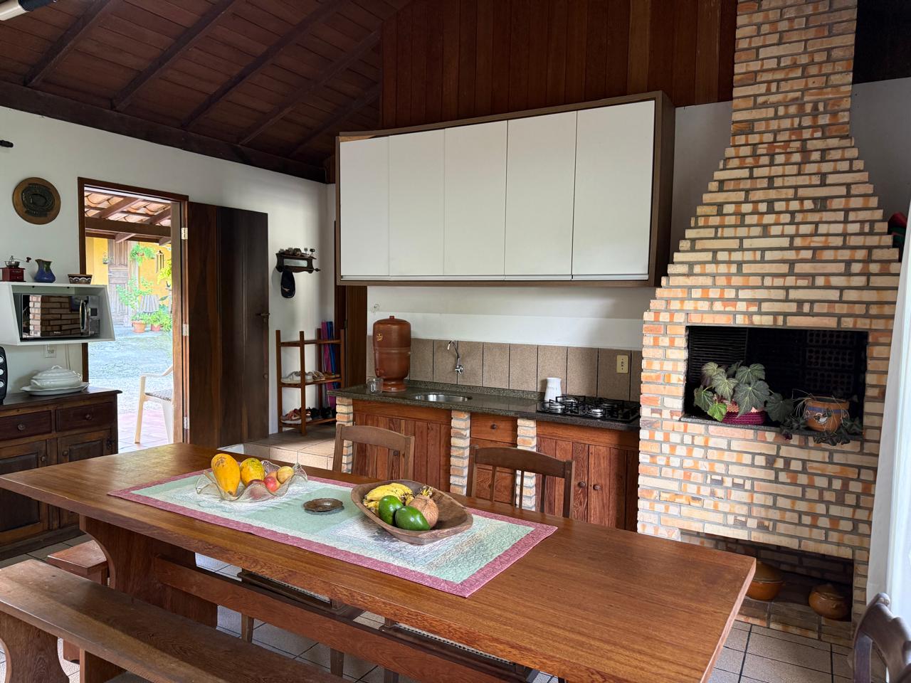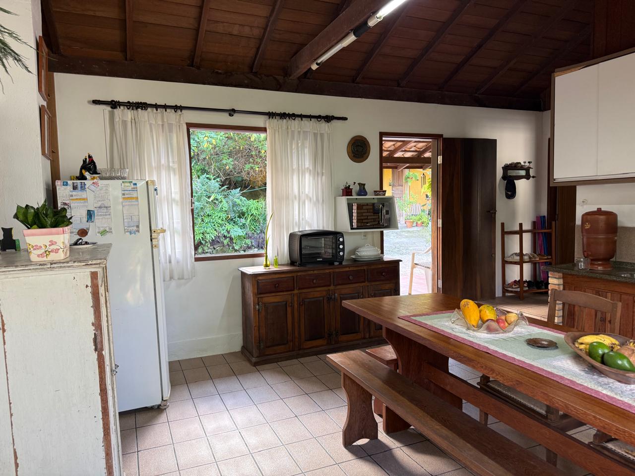 O imóvel combina perfeitamente o estilo rústico com ambientes acolhedores, trazendo elementos originais como teto com vigas aparentes em madeira, amplas aberturas que proporcionam excelente iluminação natural e integração com o verde ao redor.